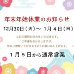 年末年始の営業日について ~2026年~2025-11-217月30日(水)臨時休業について2025-07-302025年 お盆休みについて2025-07-09年末年始の営業日について ~2025年~2024-11-202024年 お盆の営業日について2024-08-032024年ゴールデンウィーク中の営業日について2024-04-23年末年始の営業日について ~2024年~2023-11-302023年 お盆の営業日について2023-07-062023年ゴールデンウィーク中の営業日について2023-04-14年末年始の営業日について2022-12-27